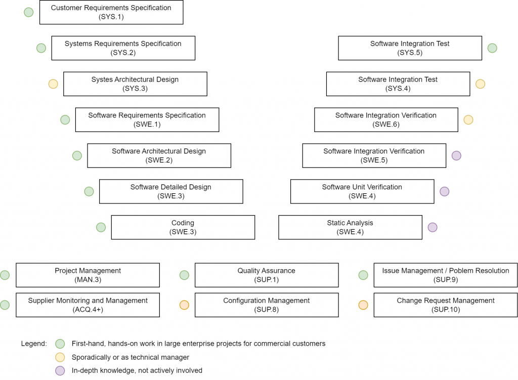 Mein technischer Erfahrungsschatz wurde als Ingenieur, technischer Projektmanager und Qualitätsmanager im gesamten V-Modell des Entwicklungslifecycle.
